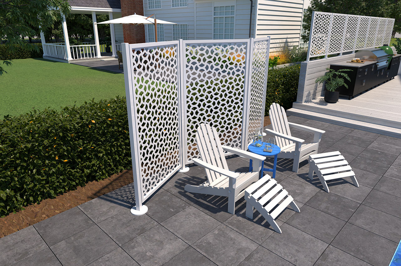 Trex Privacy is a new series of stylish and low-maintenance aluminum privacy wall panels. Offered in both permanent and moveable options, these decorative screens are available in multiple patterns with a variety of powder coated color choices to complement the aesthetic of any outdoor setting. Fixed panels are offered in 3’x3’ and 6’x3’ sizes, and 6’x3’ moveable screens are available with up to five panel configurations. Custom offerings are also available for both options.